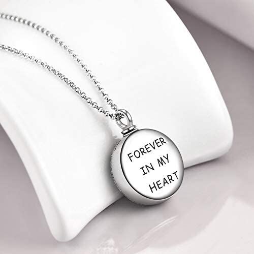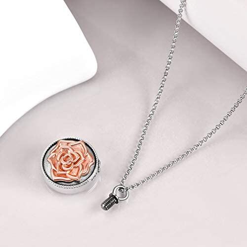 Vintage color with rose gold 3D rose flower on, engraved " Forever in my heart" at the back. Screws from the top of urn, allowing you to place a small amount of ashes in it. If you don't want/have ashes, you can also pour perfume in or add crushed flowers, dirt, hair, sand and notepaper